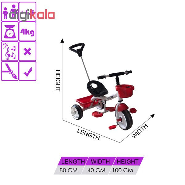 ابعاد: ۱۰۰x۷۸x۳۹ سانتیمتر, وزن: ۳.۵ کیلوگرم, نحوه کنترل و فرمان: اهرم هدایت فرمان, تعداد چرخ: ۳, نوع چرخها: پلاستیک EVA, محل قرارگیری سبد: پشت صندلی, محل قرارگیری پدال: چرخ جلو, سایر توضیحات: سه چرخه هارلی با دسته هدایت دو سبد یکی در جلو دوچرخ و دیگری در عقب آن دارای جاپایی دارای کمربند ایمنی برای کودکان زیر یک سال مناسب نمی باشد